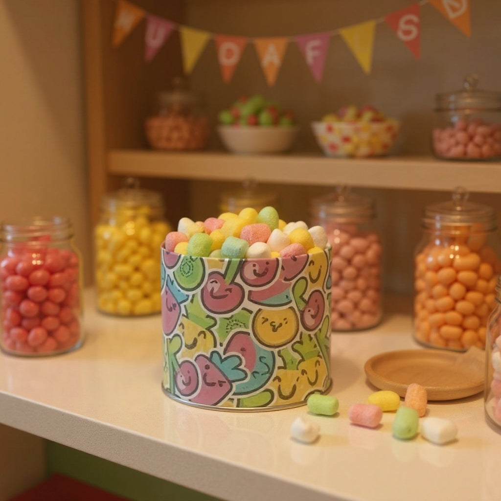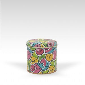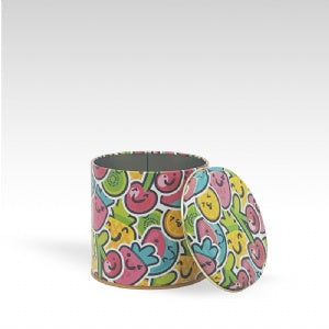 Lata com estampa de frutinhas perfeita para todas as ocasiões! Com suas cores ela traz diversão e alegria para qualquer momento.