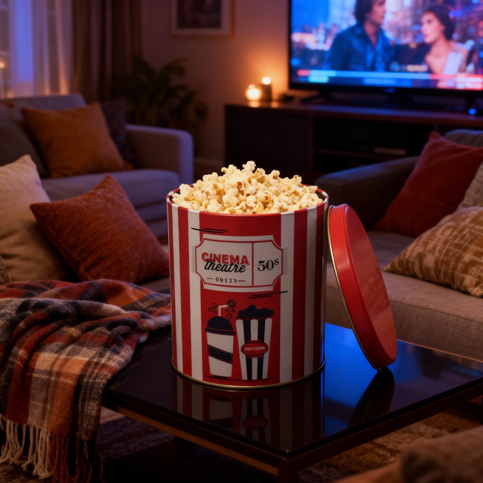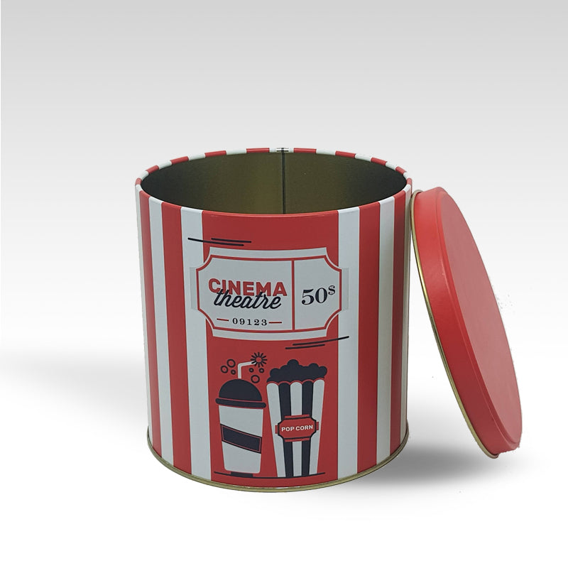 Para os amantes de filmes, a Lata Pipoca Listras é o acessório ideal para uma sessão em casa com amigos ou família. É perfeita para armazenar suas pipocas enquanto você assiste seus filmes favoritos.